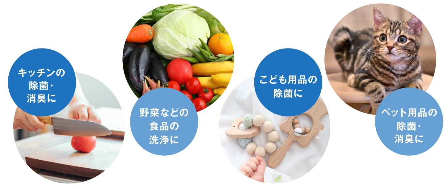 除菌、消臭、防カビ、抗ウイルスなど幅広いシーンでご利用いただけます。